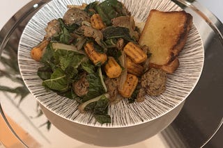 sweet potato gnocchi with rainbow chard, sage, and garlic chicken meatballs